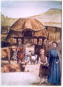 Image of a painting of a Bronze Age family outside their farm by Avril Lansdell, Curator 1968-89