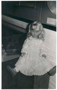Image of a doll wearing a toddler's dress of early c20th Museum Embroidery Exhibition, Thames Ditton Library